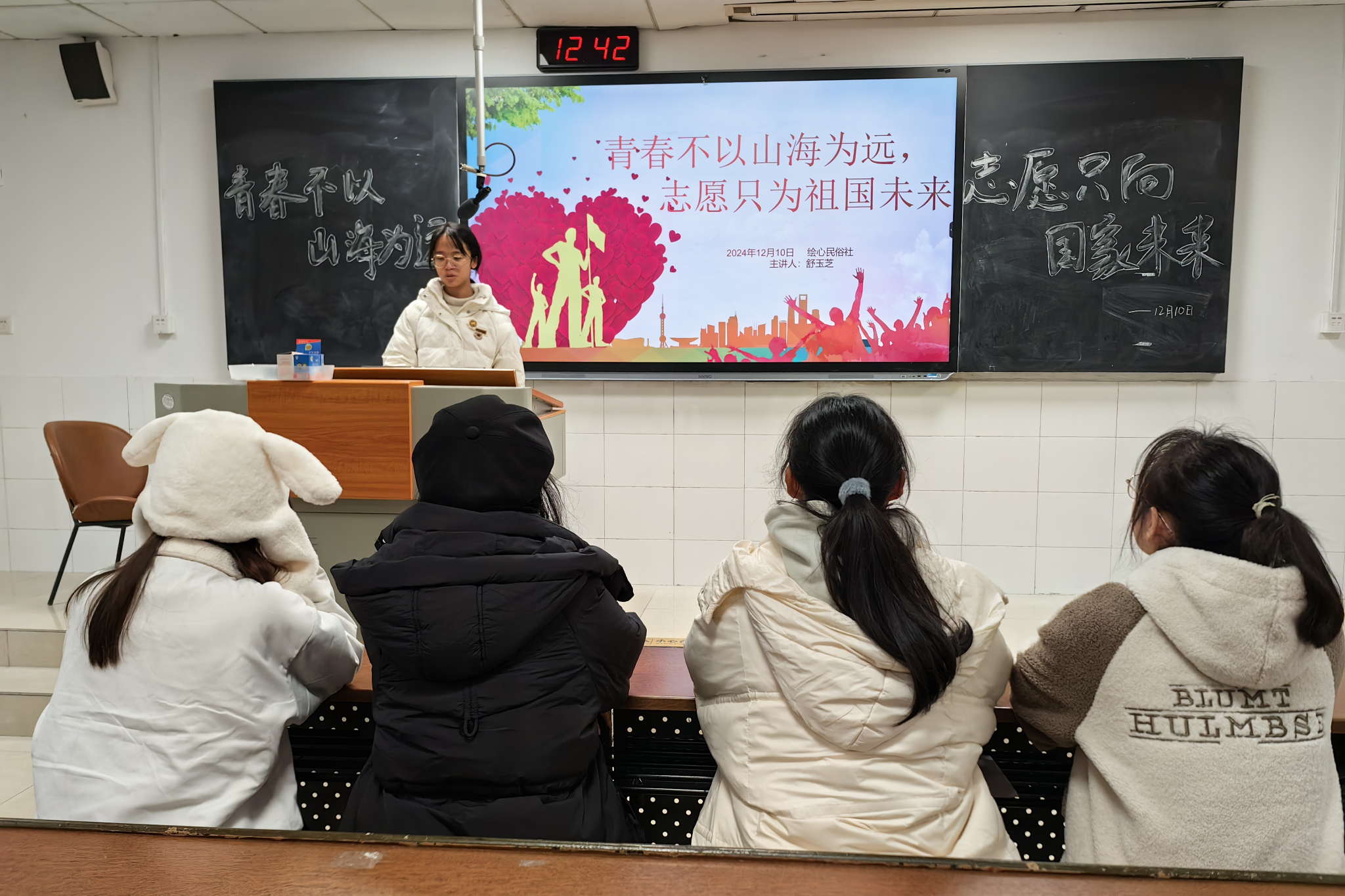 (通讯员 舒玉芝)12月10日中午,新葡的京集团8814绘心民俗社在至善楼107教室举办以“践行志愿服务——勇当志愿先锋 彰显青春担当”为主题的团日活动。此次会议由绘心民俗社理事舒玉芝主持,绘心民俗社理事会全体成员参与。
