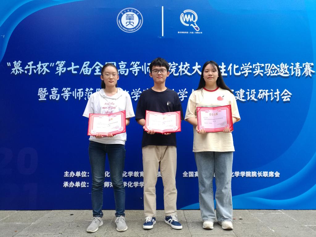 为了体现比赛的公平与公正,大赛组委会从各高师院校提交的学生名单中随机抽选3名学生参赛。比赛时间为两天,包括8小时的实验操作比赛和1小时的笔试环节。参赛选手首先通过现场抽签分成无机化学及分析化学实验、有机化学及分析化学实验、物理化学实验三个组别参加实验操作比赛,之后全体学生完成实验理论知识笔试,根据两个环节成绩计算总成绩,按总成绩高低评定一、二、三等奖。经过激烈的角逐,我校化学专业2018级本科生苏文韬、马士蒙双双荣获一等奖,秦子怡荣获二等奖,取得我校参加该赛事以来的最好成绩,充分展现了近年来我校国家一流专业建设点—化学专业在提高学生实践能力和创新能力、提升人才培养质量等方面取得的良好成效。