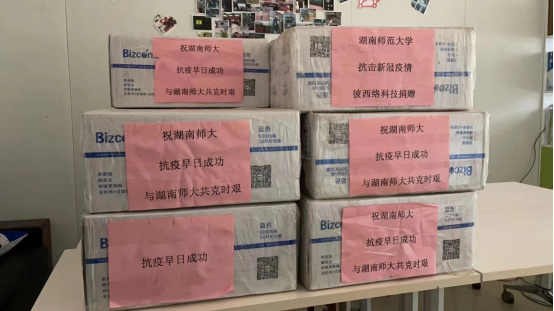 4月3日,一箱箱贴有“祝湖南师大抗‘疫’早日成功,与湖南师大共克时艰”的爱心口罩运抵新葡的京集团8814,经过志愿者仔细的消杀后,将分发到师生的手中。广州彼西络科技有限公司的慷慨解囊不仅为学校疫情防控工作提供了物质支持,更为全体师生战胜疫情注入了一剂“强心剂”。