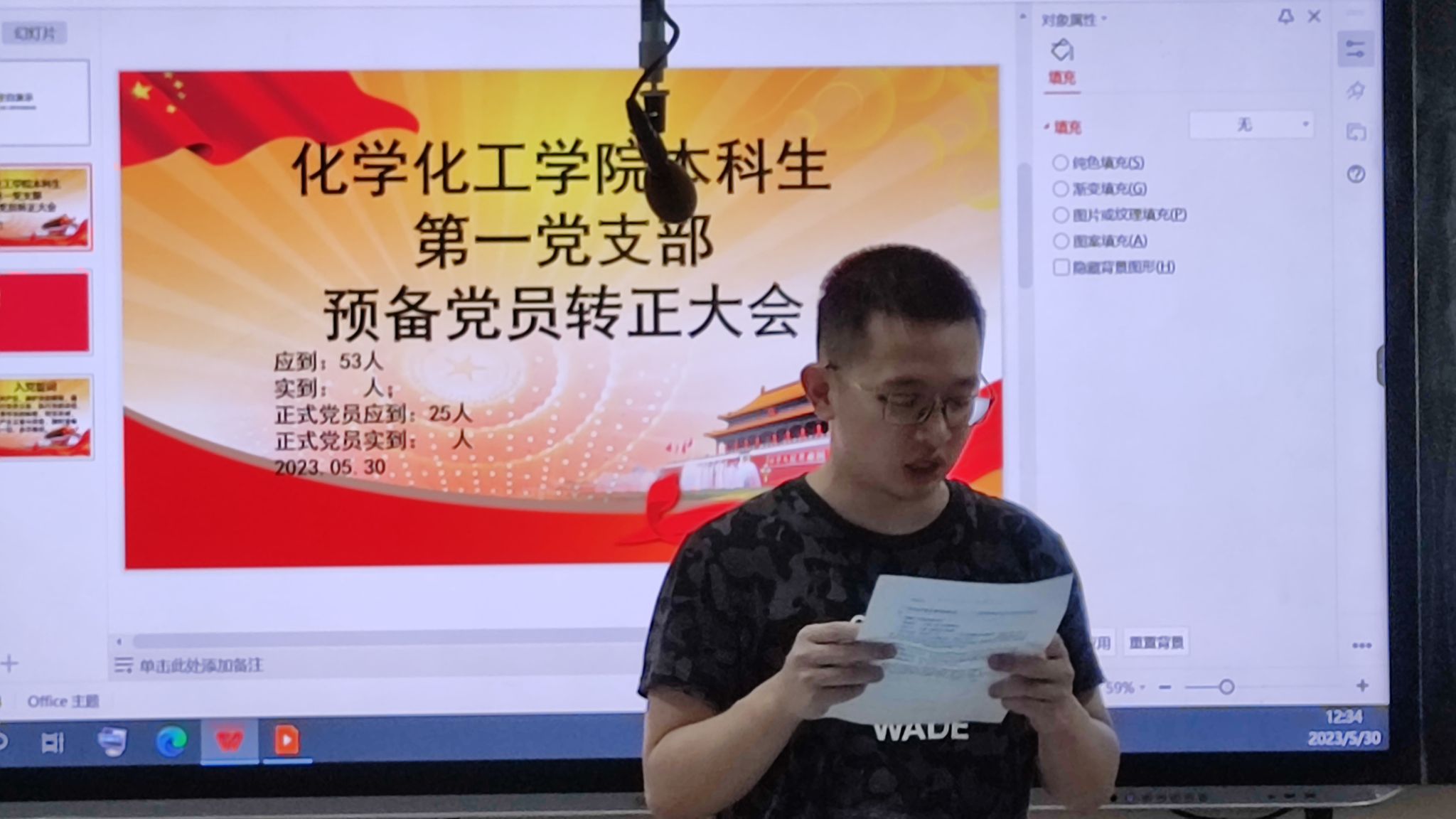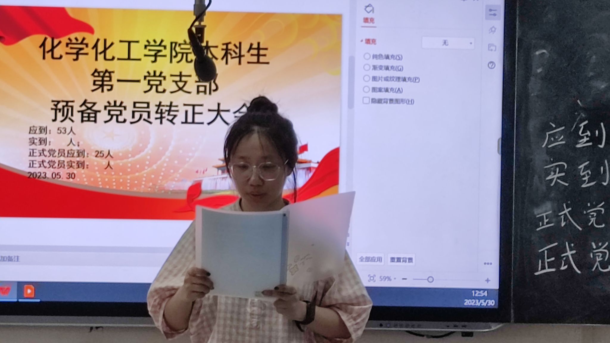 此次会议由向皓主持,王昆担任监票人,王贺雷担任计票人,向皓简述转正大会流程。符合转正条件的预备党员依次上台进行思想汇报,党支部委员一次宣读入党介绍人意见并进行现场投票。向皓同志宣读决议,王清等8名同志全票通过,如期转正。